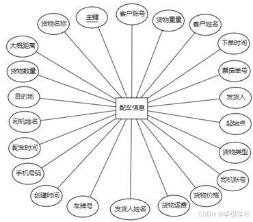 配车信息实体包括大概距离、货物数量、目的地、货物名称、主键、客户账号、货物重量、客户姓名、下单时间、票据单号、发货人、司机姓名、配车时间、手机号码、创建时间、车牌号、发货人姓名、货物运费、起始点、货物类型、司机账号、货物价格。配车信息实体属性图如图4-5所示: