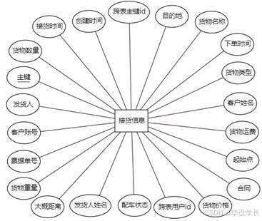 接货信息实体包括接货时间、货物数量、主键、发货人、创建时间、跨表主键id、目的地、货物名称、下单时间、货物类型、客户姓名、客户账号、票据单号、货物重量、大概距离、发货人姓名、配车状态、跨表用户id、货物运费、起始点、合同、货物价格。接货信息实体属性图如图4-3所示: