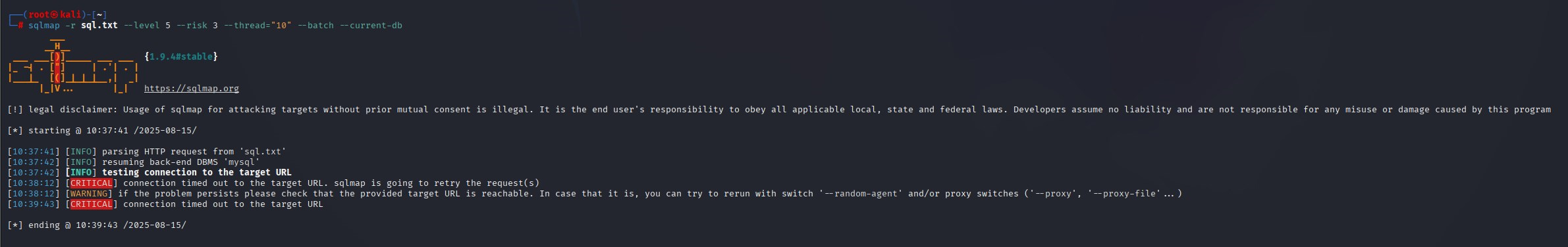 sqlmap -r sql.txt --level=5 --risk=3 --thread="10" --batch --current-db 直接是跑不出