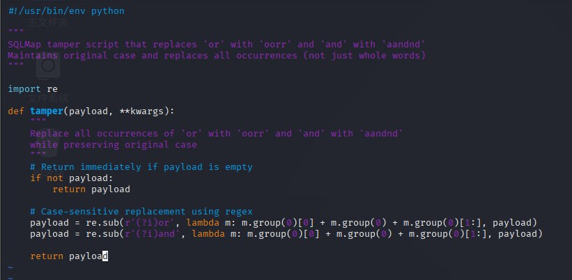 利用ai编写关于sqlmap的tamper模块py脚本,要求将or改为oorr,and改为aandnd,字符串中有or和and的都改掉。必须得加入--tamper oorr_aandnd.py。