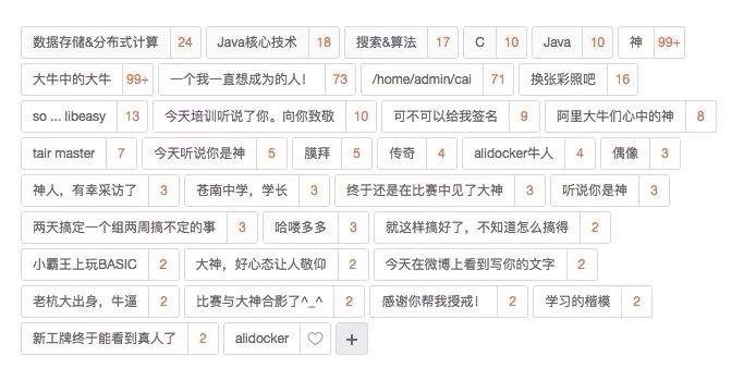 阿里内网里多隆的个人页面,童鞋们打得最多的标签是“神”“大牛中的大牛”