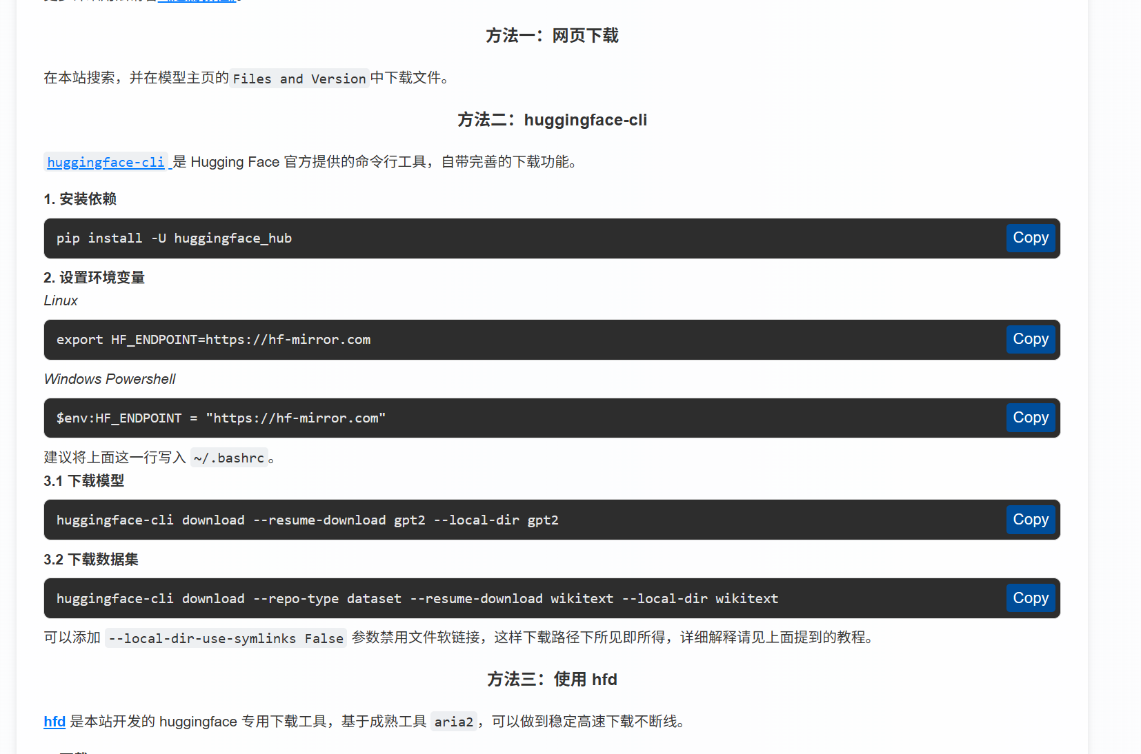 三种方法,第一种网页下载,emmm,我觉得很慢,非常慢,第二种huggingface-cli,我也失败了,总说huggingface-cli: command not found,最后用第三种,我觉得还是蛮快的