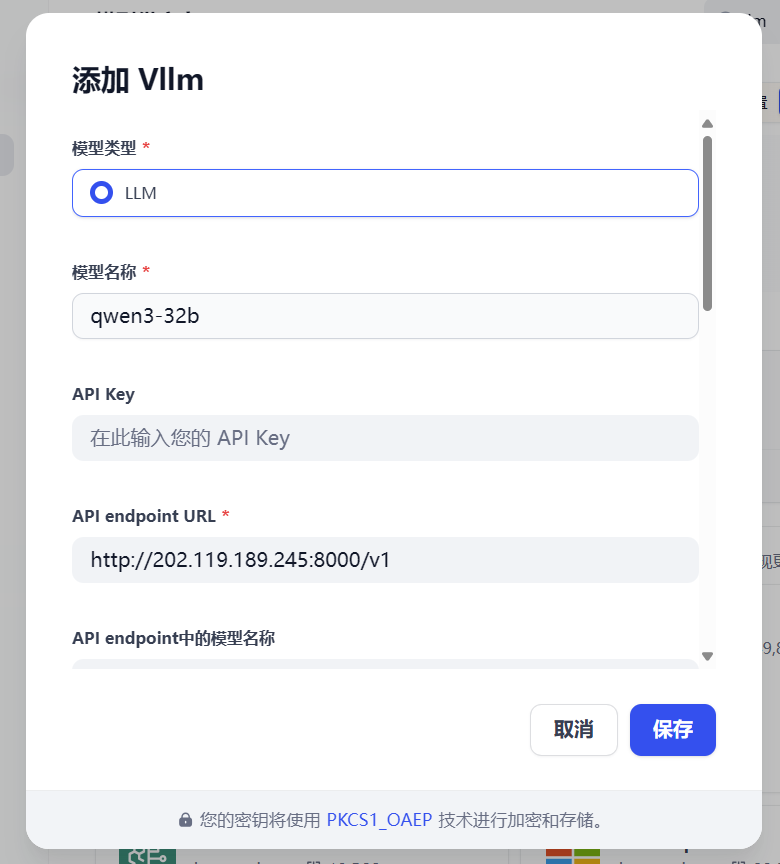 注意这里的名称不是随便填的,网上有些说是“vLLM启动时候带的大模型地址,或vLLM指定的大模型名称”之类的,我是感觉表达的不清楚,建议按以下方法做