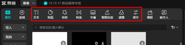 这些特殊效果主要指方框中框出的菜单栏,对添加的文本、贴纸和特效等有效,但对素材、音频等素材没有联动效果。