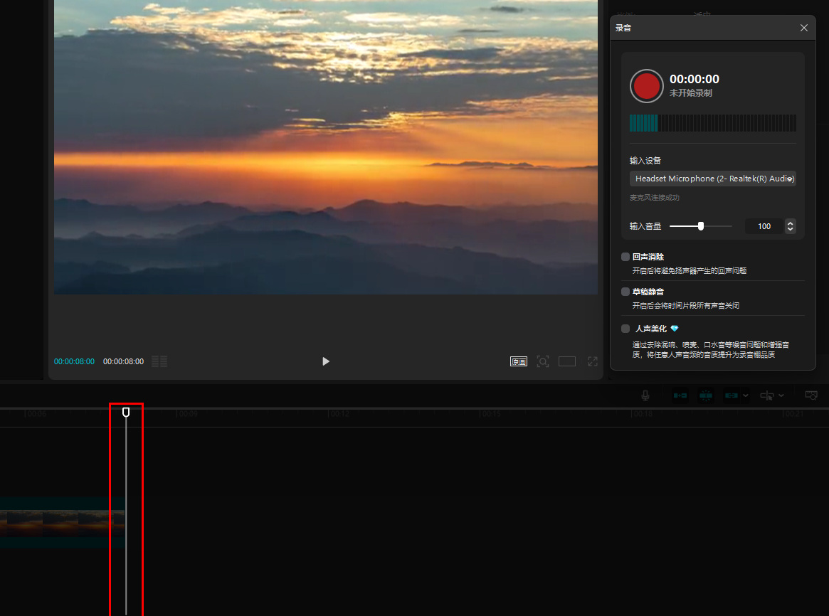 开启录音后,会弹出一个录音框。点击框里的红色按钮,就开始录制啦。下方有勾选按钮,可以对录制的声音进行美化。左下方的时间滑块能决定录制后的音频出现的位置,拖动它就能选择在什么地方插入录音。