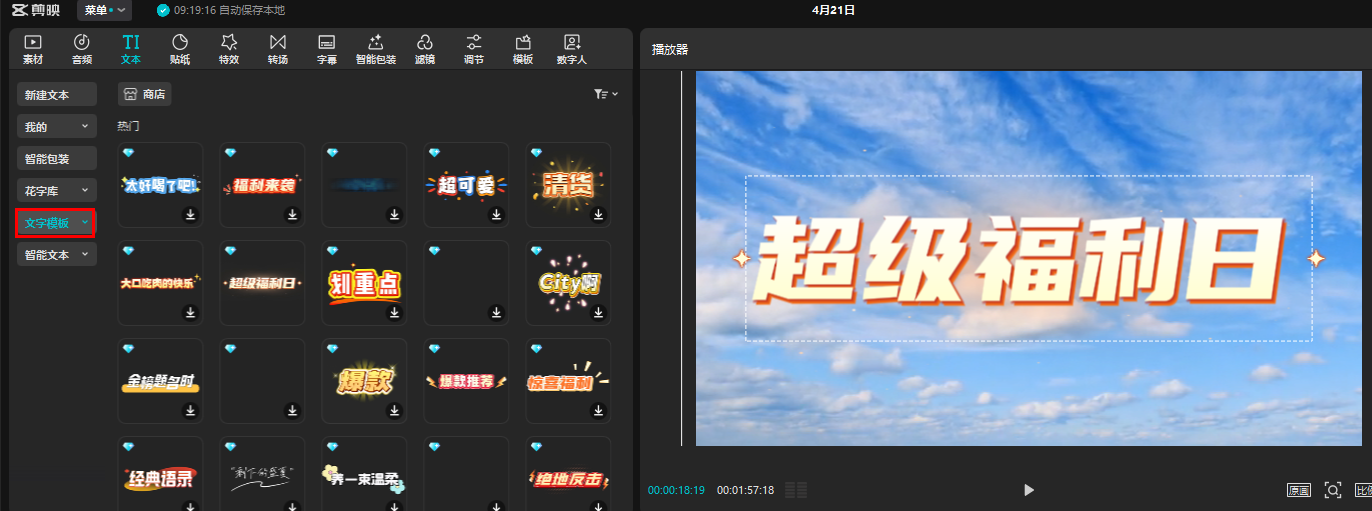 左侧同样有个文字模板导航栏,这里提供的是已经制作好的文字模板,和花字库不同的是,这里的文字模板还附带动画功能。