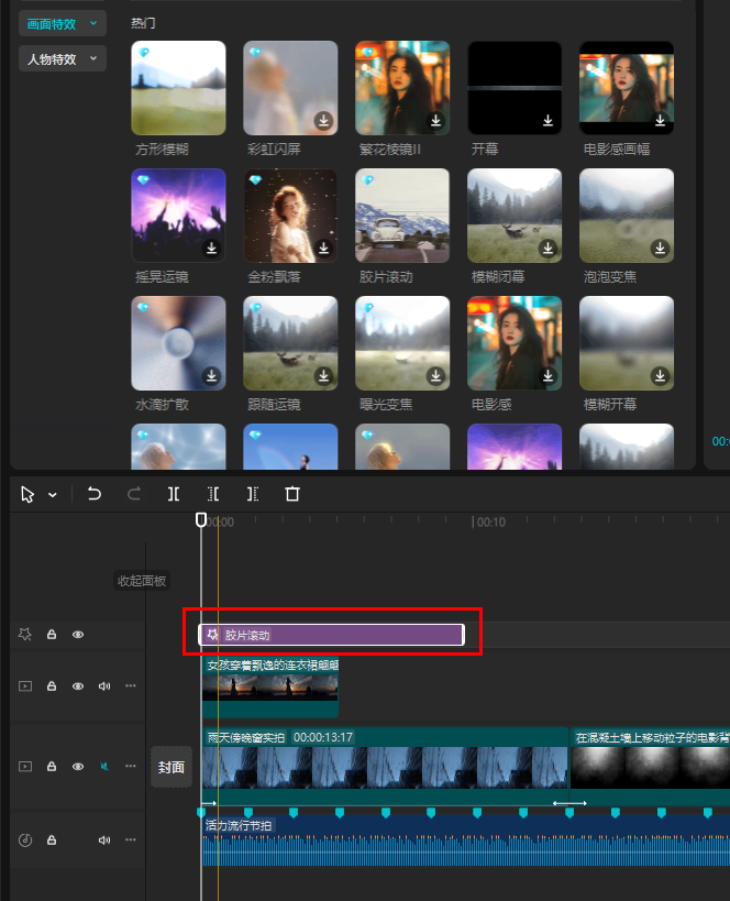 咱们也可以手动把特效拖动到素材上,为单个素材添加特效。这样,素材面上就会显示当前运用的特效。