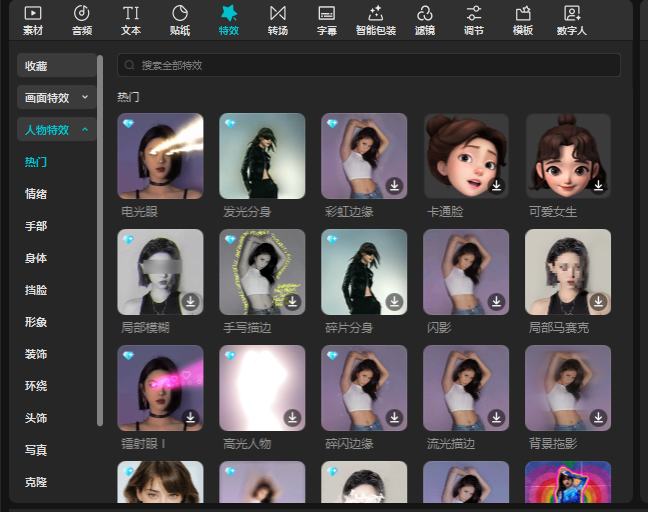 人物特效是根据程序检测是否符合人体特征来生成对应的特效的,它会自动识别人体部位,并在相应位置添加特效。