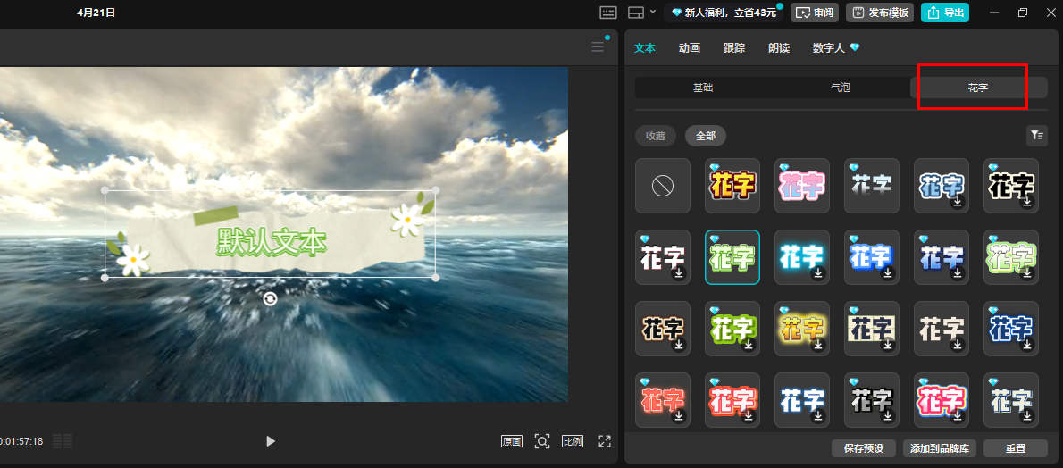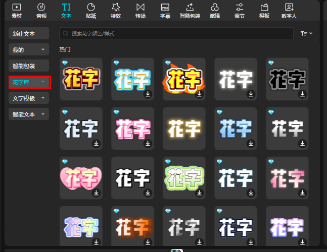 在左侧还有个花字库,在这里可以直接使用提供好的花字进行文字编辑,省去了在新建文本中选花字的步骤。