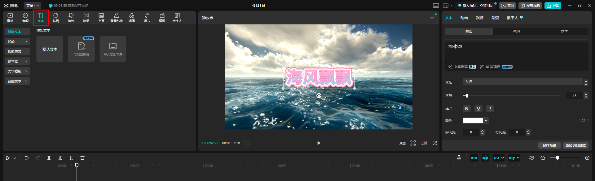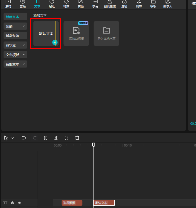 剪映能为素材添加各种包装,让视频效果更出色。咱们先从文本开始。点击“文本”后,左边默认是新建文本选项。