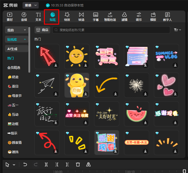 贴纸就像是素材的装饰品,贴纸库里有很多自带动画的贴纸素材,咱们还能为它们添加动画,让视频的表现形式更加丰富多样。