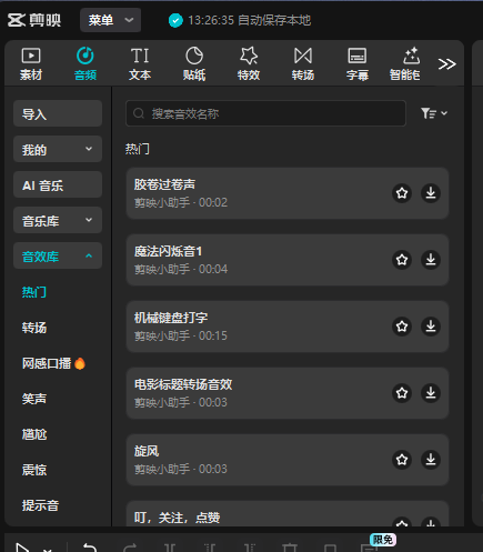 音效库也是剪映提供的,里面有各种各样的音效素材,还根据不同的音效作用进行了分类。咱们可以自由选择适合的音效。