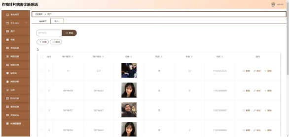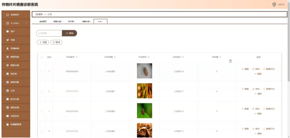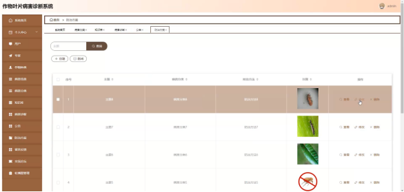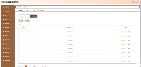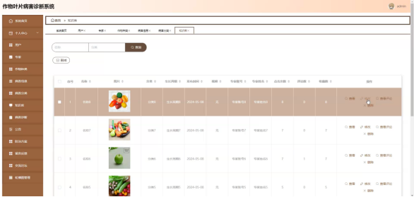 病害信息;在病害信息页面选择作物种类进行查询、作物种类或删减病害信息列表,并对病害信息详细信息进行查看、修改或删除操作;如图5-12所示:
