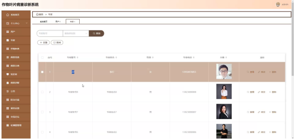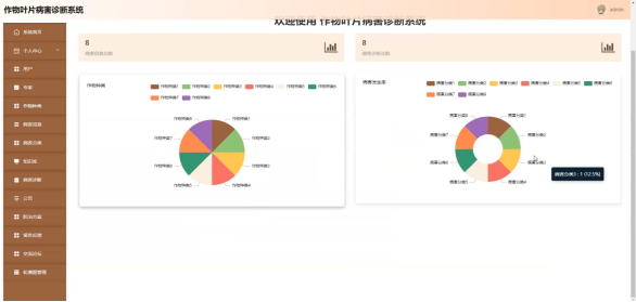 管理员进入主页面,主要功能包括对个人中心、用户、专家、作物种类、病害信息、病害分类、知识库、病害诊断、公告、防治方案、留言反馈、交流论坛、轮播图管理等进行操作。管理员主页面如图5-8所示: