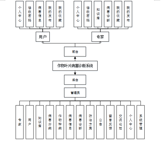 作物叶片病害诊断系统的设计与实现,最主要的是满足使用者的使用需求,并且可以向使用者提供一些与系统配套的服务。本篇论文主要从实际出发,采用以对象为设计重点的设计方法,因此在进行系统总体的需求分时借助用例图可以更好的阐述各个功能模块之间的关系,以及明确系统使用者之间的联系。本系统的设计包含管理员、专家和用户三个角色。