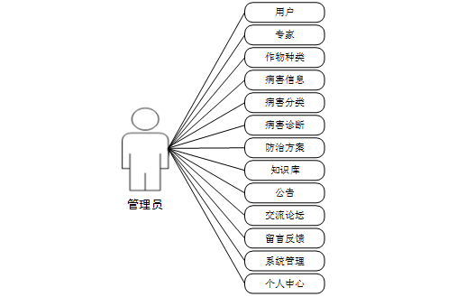 管理员模块:管理员是系统中的核心用户,管理员登录后,可以对后台系统进行管理。主要功能有个人中心、用户、专家、作物种类、病害信息、病害分类、知识库、病害诊断、公告、防治方案、留言反馈、交流论坛、轮播图管理等功能。管理员用例如图3-2所示。