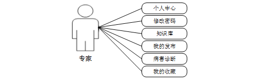 专家模块:专家登录后可以对个人中心、修改密码、知识库、病害诊断、我的发布、我的收藏等功能进行操作。专家用例如图3-4所示。