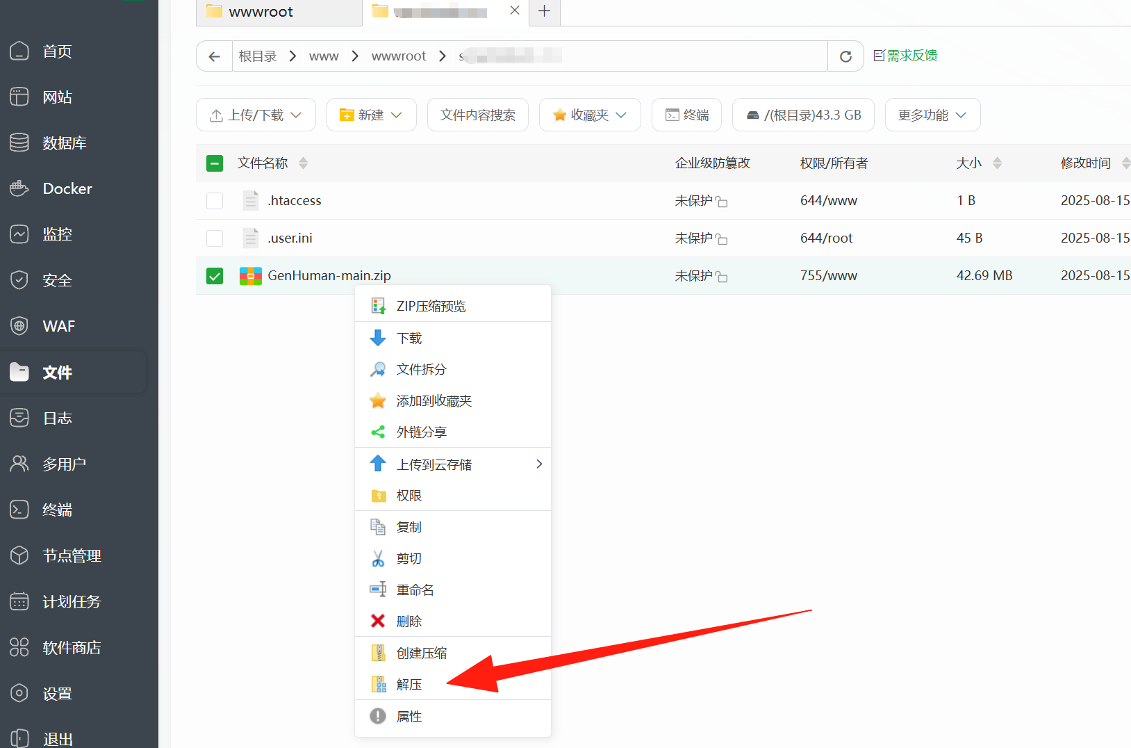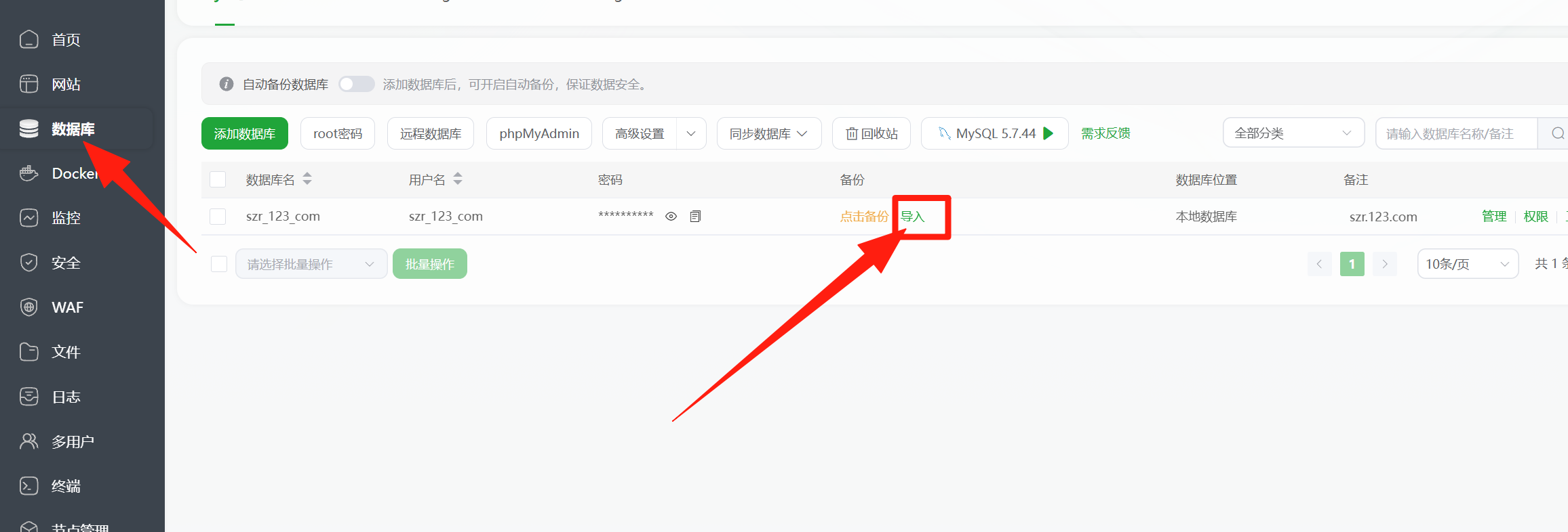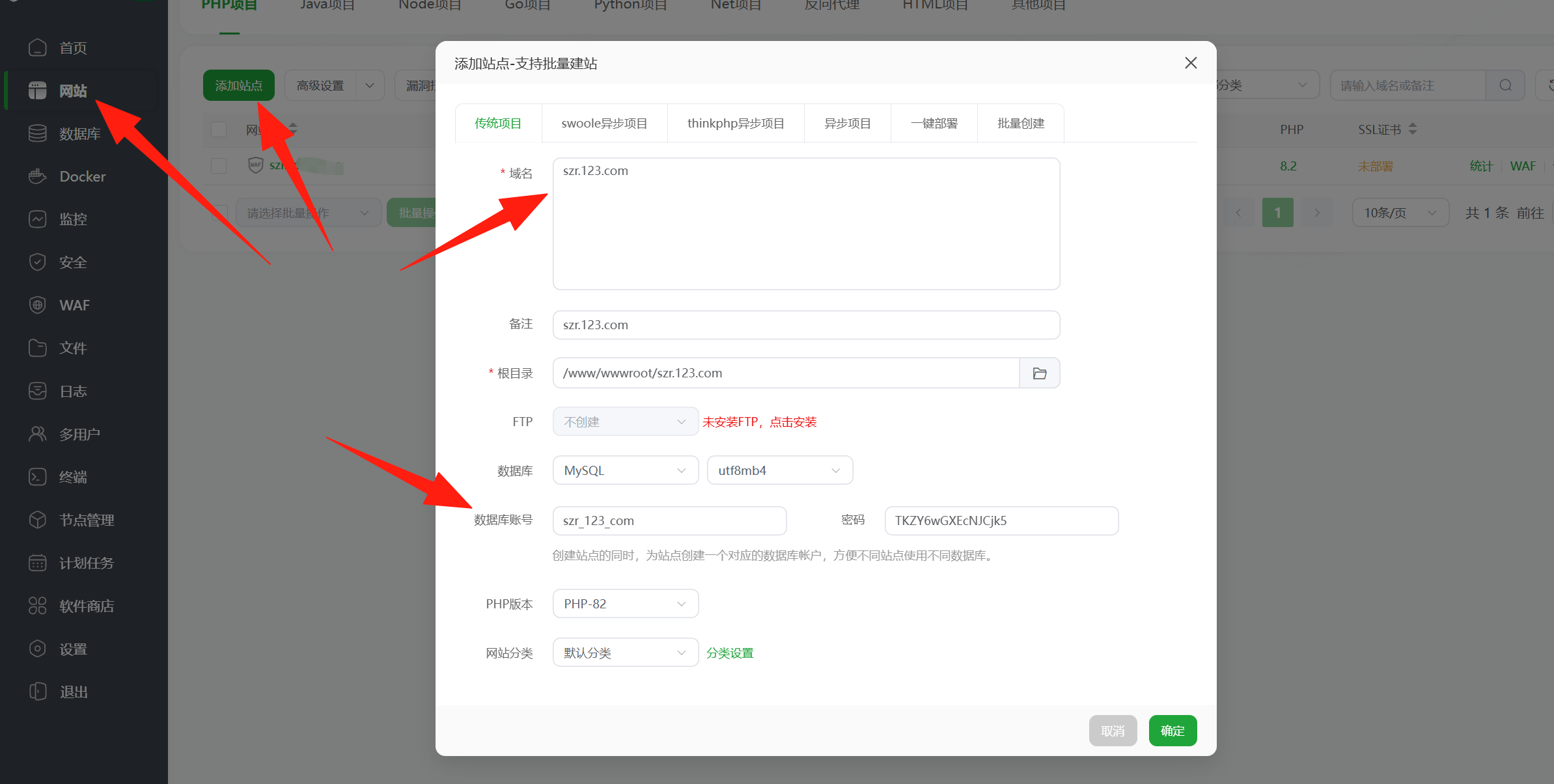6.点击网站,新建一个站点,输入已绑定的域名,如果没有绑定域名的话,暂时可以输入ip进行临时用,然后将下载好的源代码上传上去,进行解压!(数据库可以先开启,让系统给你生成账号密码)