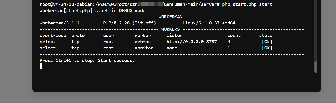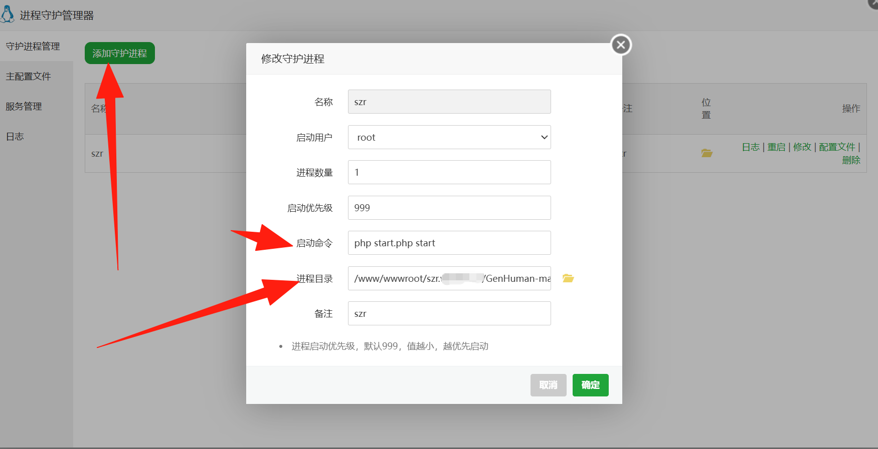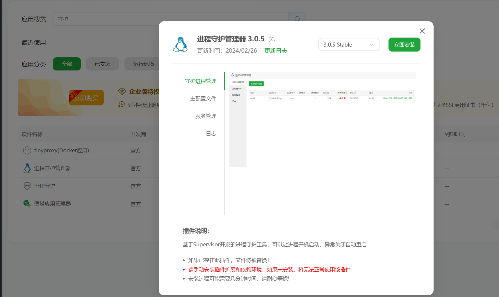 15.因为关闭终端就会终止程序运行,所以想要长期运行的话就需要安装一下"进程守护管理器"这个插件,然后根据我的教程来配置一下,确保这个项目一直运行!目录选择到server目录就行,然后启动命令是php start.php start(切记确定之前先关掉上面的终端,以免启动失败)