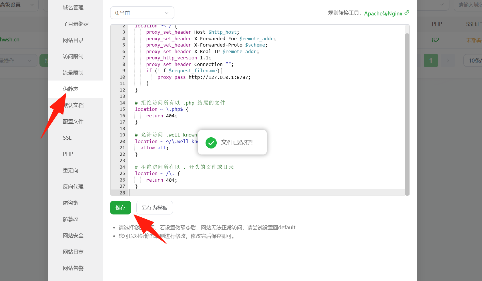8.然后点击伪静态进行伪静态设置,将下面的伪静态代码复制进去!