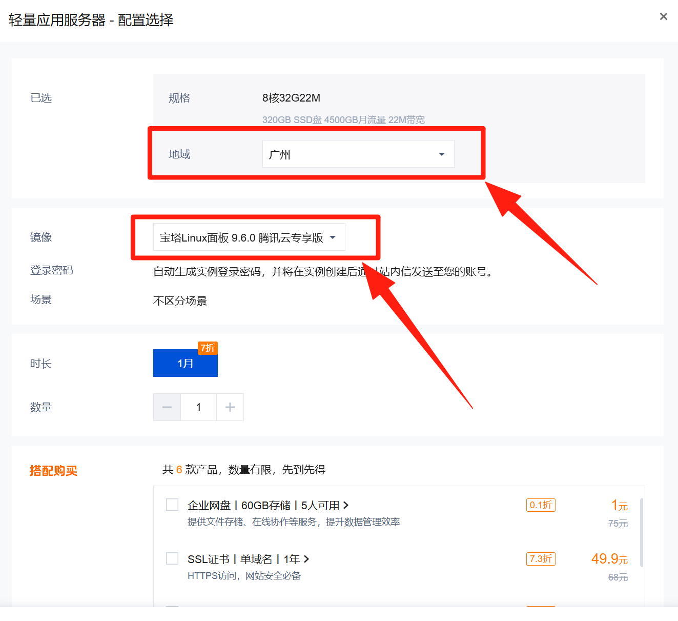 3.找到合适价格后,点击立即购买,右边就会弹出配置信息,地域可以选择离你最近的区域,当然这个也无所谓,国内的延迟基本上都一样,不会相差很大!镜像这块我们一定要选择宝塔面板专属版。