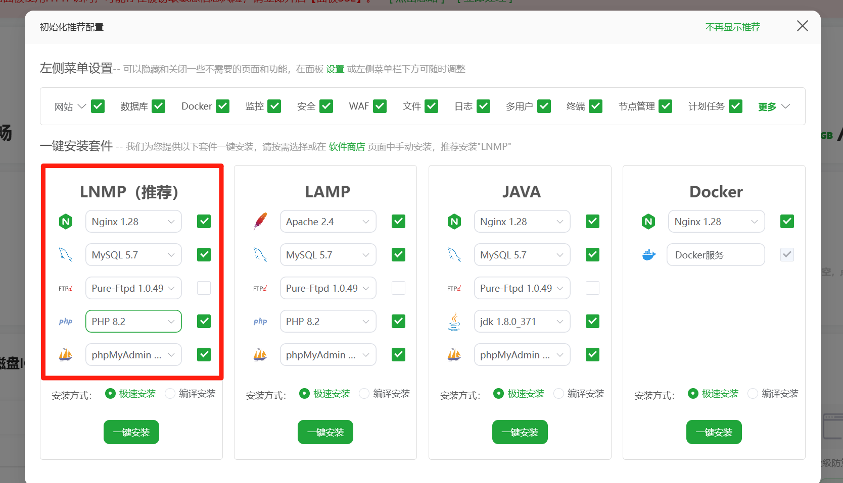 3.开启端口后就可以刷新刚才的页面了,输入账号密码,就能进入宝塔面板后台了,第一次登录会弹窗提示登录,没有账号的可以先注册!登录后我们选择这个环境安装即可!