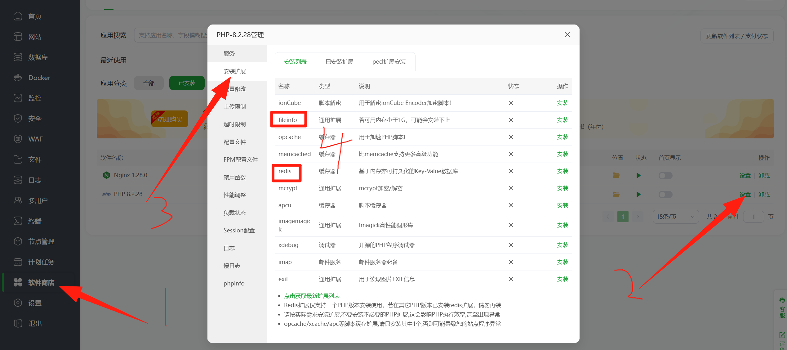 5.环境和下载都完成了后,我们安装一下redis、fileinfo扩展,在软件商店-找到安装的php,然后点击设置进入扩展安装扩展。