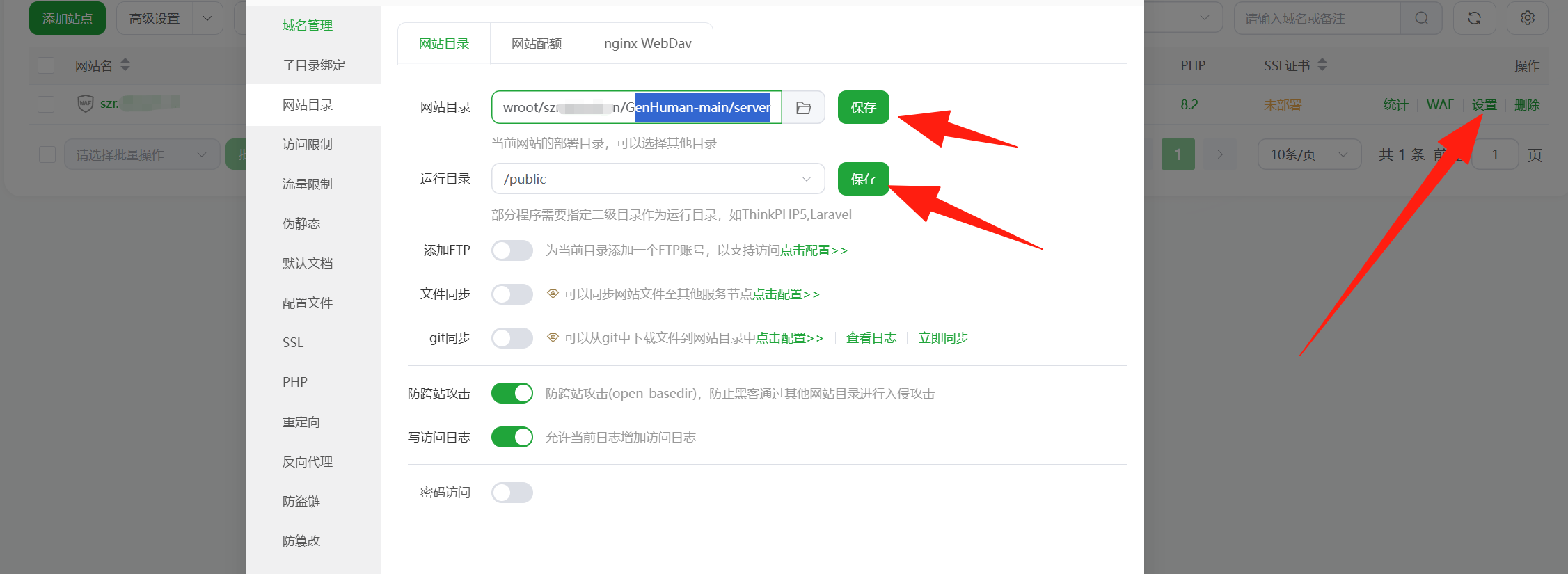 7.然后进入网站设置,找到网站目录,选择刚才解压的目录里的server目录,选择完了后先保存,保存后再将运行目录选择public文件,然后保存。