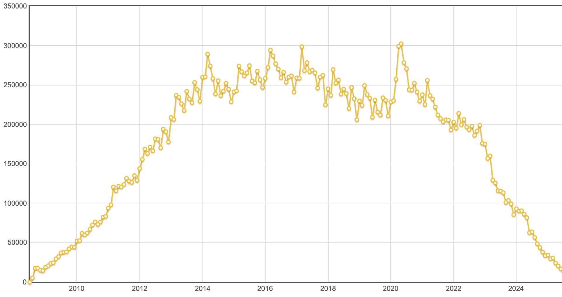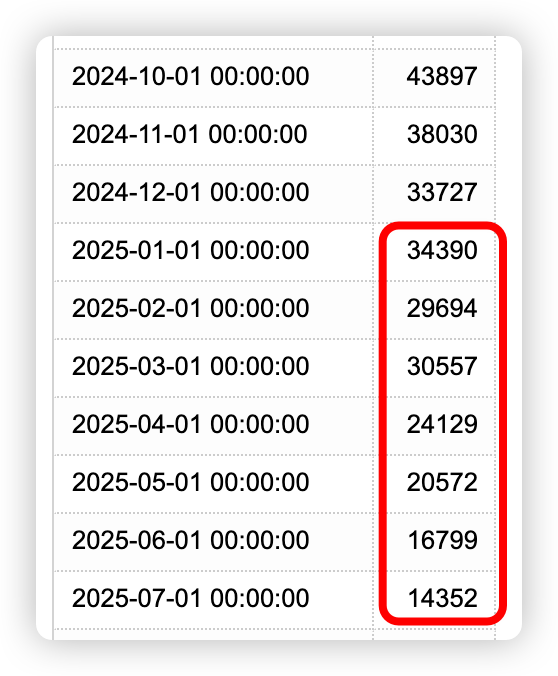 这个曲线图表示的是自 2008 年开始,一直到 2025 年的今天,这 17 年时间,Stack Overflow 社区上每个月新问题个数的变化趋势。