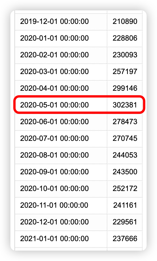 从数据上来看,Stack Overflow 最高光的顶峰时刻出现在 2020 年,尤其是在 2020-05-01 这个时间节点,新问题个数来到了 302381 的顶峰。