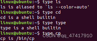 type 命令是 shell 内部命令,它会显示命令的类别,给出一个特定的命令名(做为参数)。