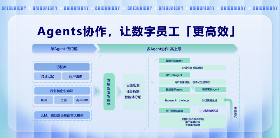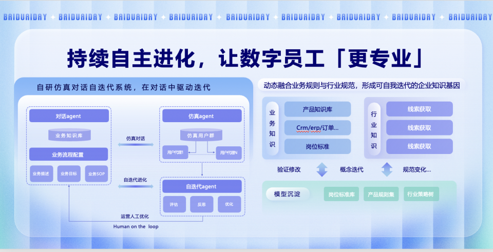 近日,在百度AI Day开放日上,百度智能云智能营销产品部副总经理张红光携「 “懂业务、给结果、可进化”的数字员工」亮相,深入阐述了这一“进化型AI生命体”的构成:将十年积累的百家行业SOP、先进的多智能体协同引擎及仿真自迭代系统深度整合,转化为驱动企业增长的全新核心引擎。本文整理其演讲精华如下: