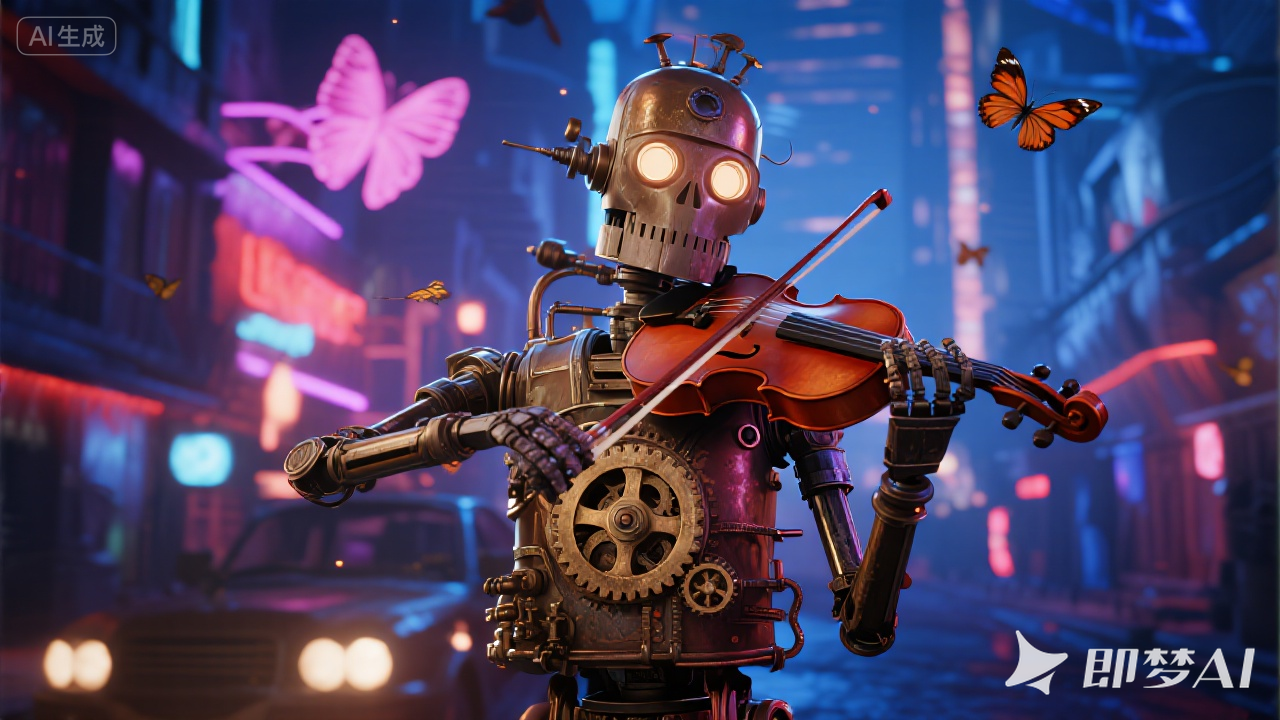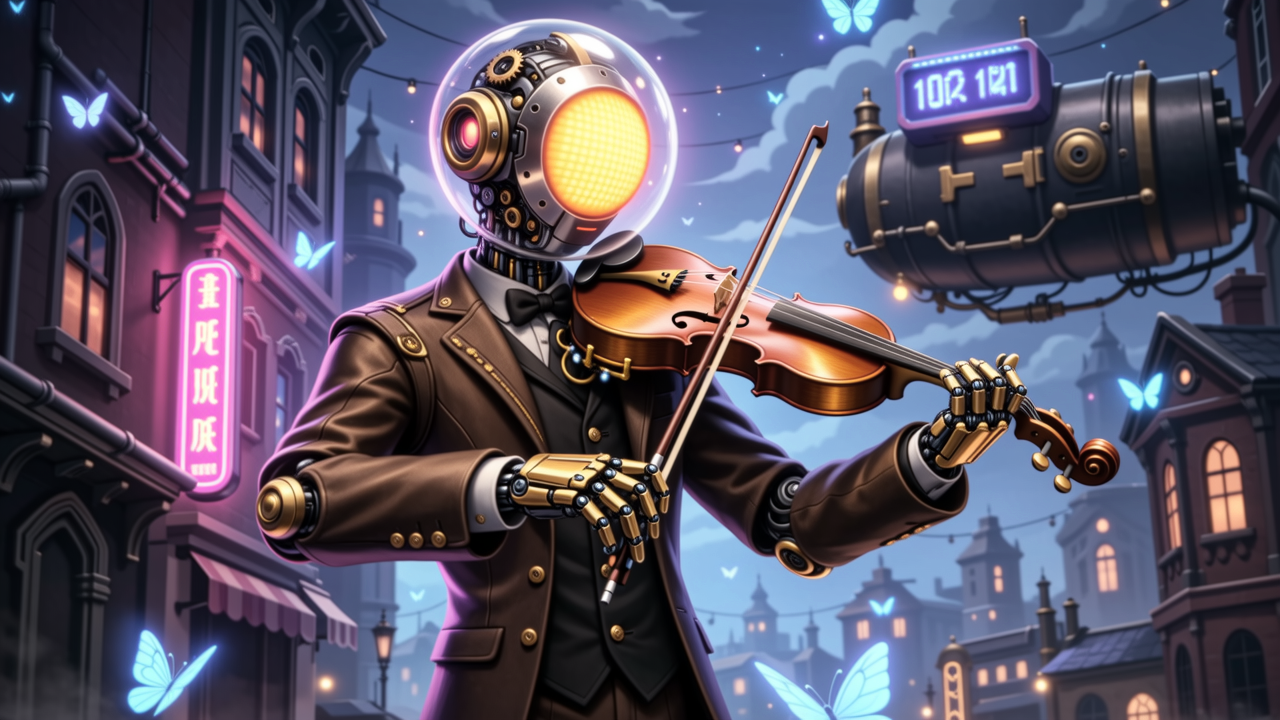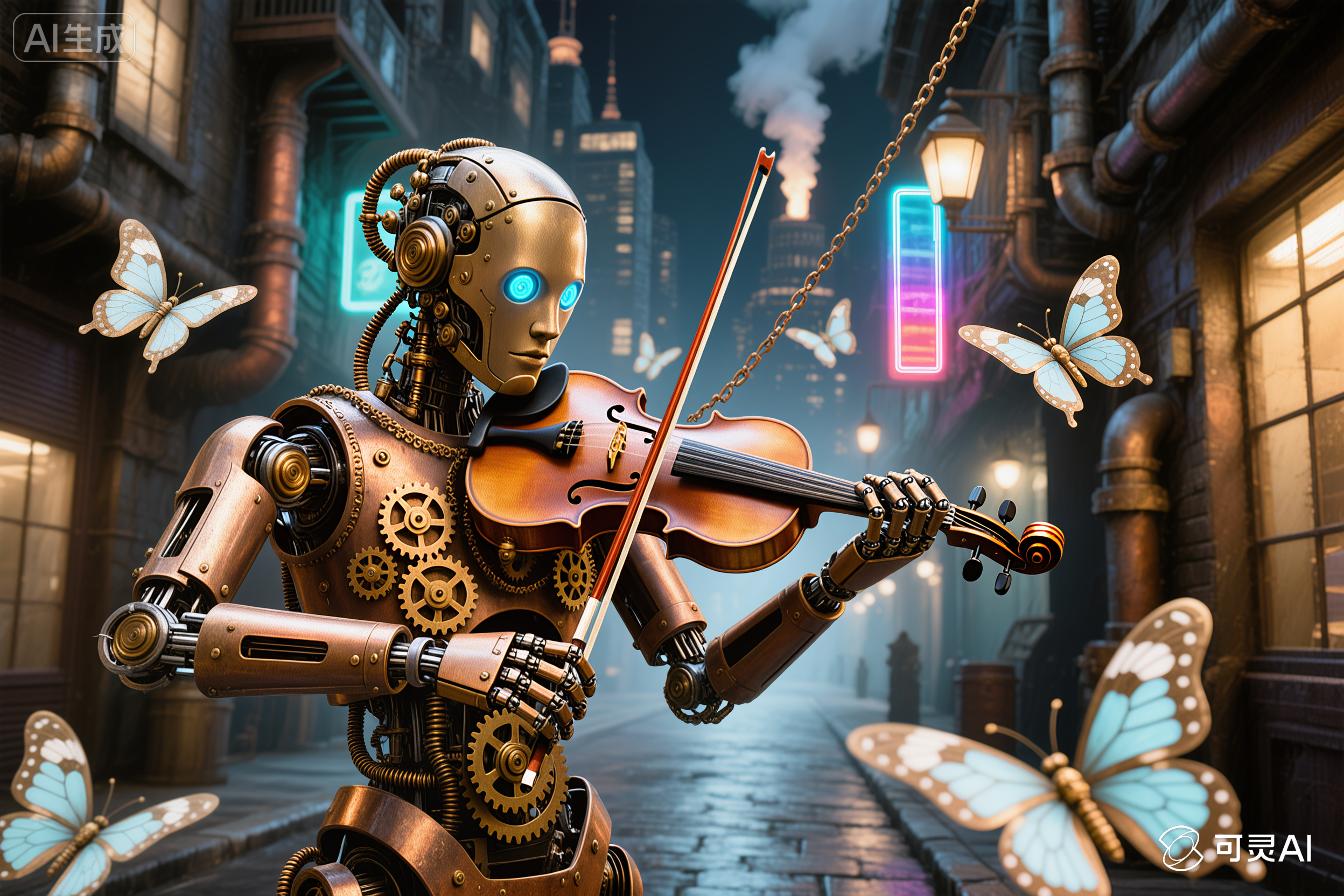 一个在蒸汽朋克风格城市街道上的机器人音乐家,正在演奏一把由齿轮和铜管制成的小提琴,周围有闪烁的霓虹灯和飞舞的机械蝴蝶