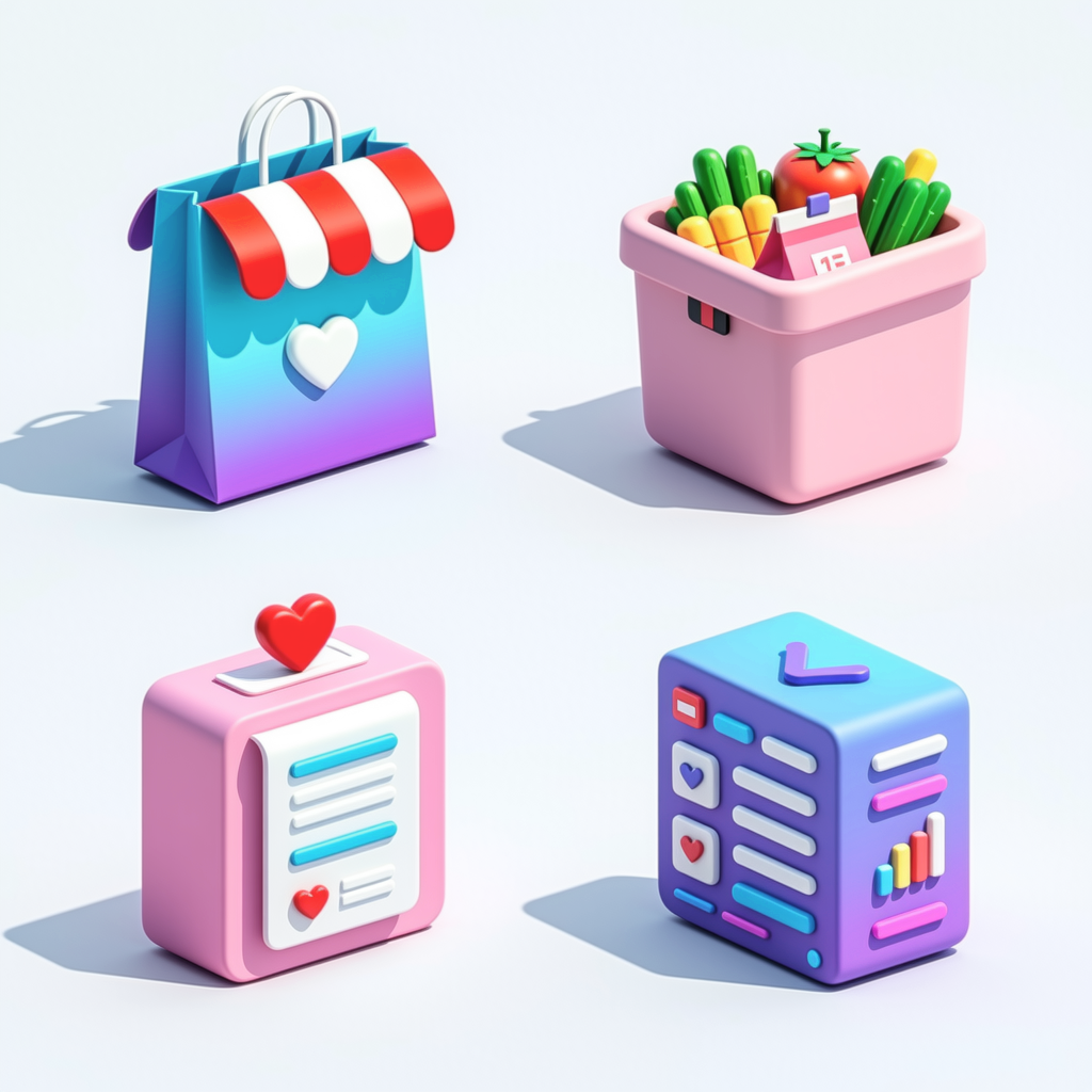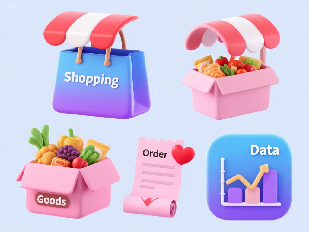 绘制一组适用于电商平台的图标,以明快的色彩和圆润的造型呈现。购物袋(Shopping)用蓝紫渐变搭配红白遮阳篷,装满果蔬零食的箱子(Goods)是粉色系,订单(Order)用粉色纸卷加红心点缀,数据(Data)以蓝紫配色的图表展现,风格清新时尚。