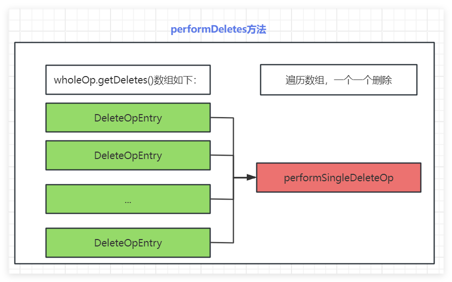 从上面代码分析可以看出,如果wholeOp携带有多个DeleteOpEntry(也就是singleOp )操作,则循环对singleOp 进行处理,这个处理过程由performSingleDeleteOp(...)接口实现。