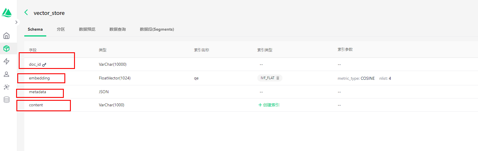 注意这几个字段:这个spring-ai-milvus默认的id就是doc_id,且,他会插入数据,所以创建的时候不能用自增,后面的embeding是向量字段,跟你的embedding模型维度一致即可,content就是原为,metadata字段,这几个都是必须字段,缺一不可,缺少就报错