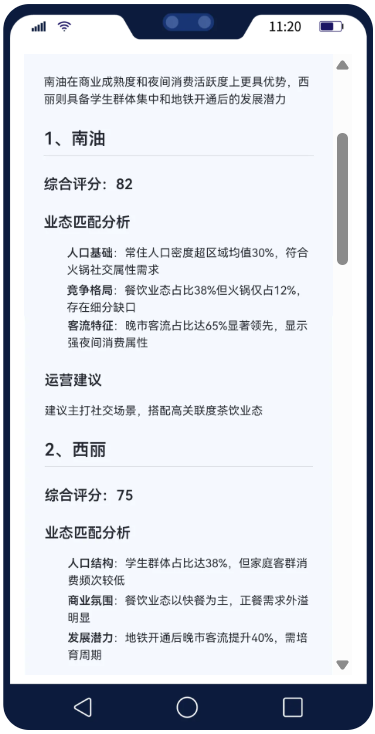 当您提出“位置推荐”或“位置对比”的咨询时,AI引擎将瞬间调动庞大的数据资源与智能模型,为您生成一份清晰、直观、多维度的位置评估报告。
