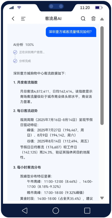 例如,您想快速了解深圳壹方城购物中心的客流概况,只需直接询问客流易AI:“深圳壹方城客流量情况如何?”