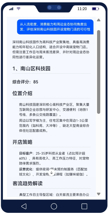 例如,您计划在深圳南山科技园区域开设一家宠物店,但不确定市场可行性。您可以提出更复杂的分析需求:“从人流密度、消费能力、周边业态协同角度出发,评估深圳南山科技园开设中高端宠物店的可行性。
