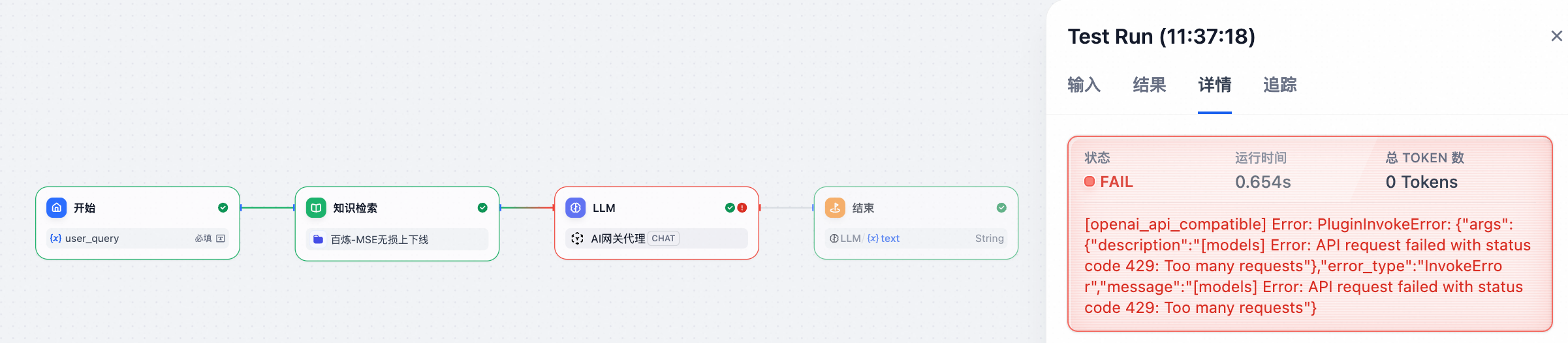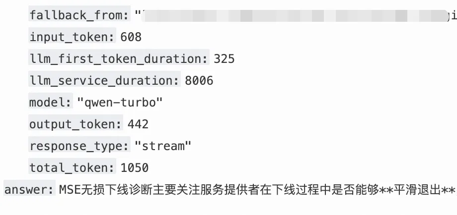 通过网关日志我们能够看到,AI 网关在访问主模型服务时发生了 503 异常,于是自动 Fallback 到了百炼 qwen-turbo 模型进行了调用,并返回了正常调用结果,从而保证了 Dify 应用整体运行正常。
