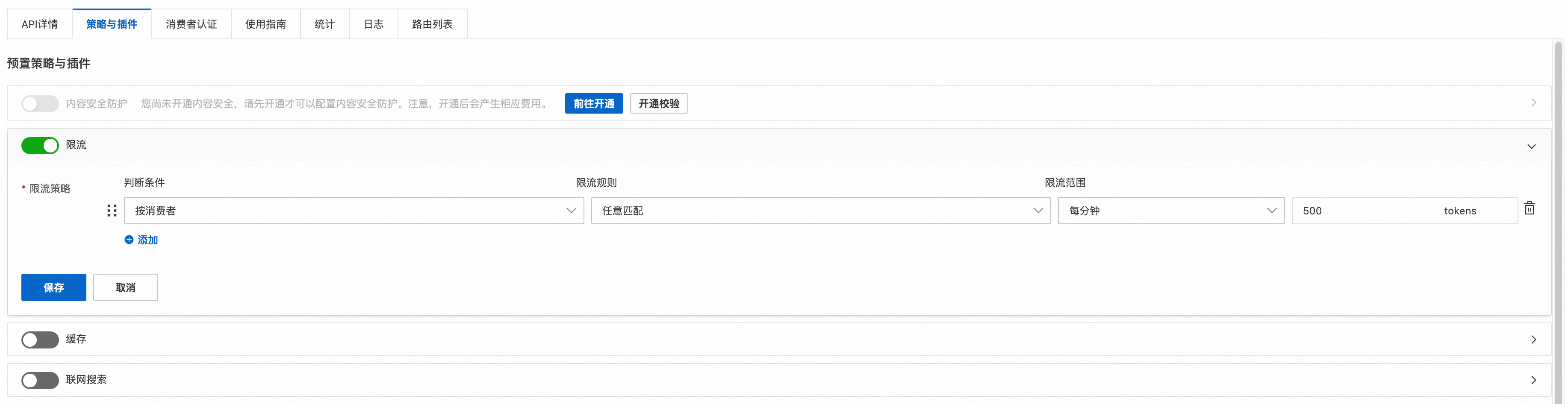 在该例中,配置全局 500 token/min,配置生效后,当模型服务整体在 1 分钟时间范围内超出 500 token 消耗后,访问模型的请求将会被 AI 网关直接拒绝。