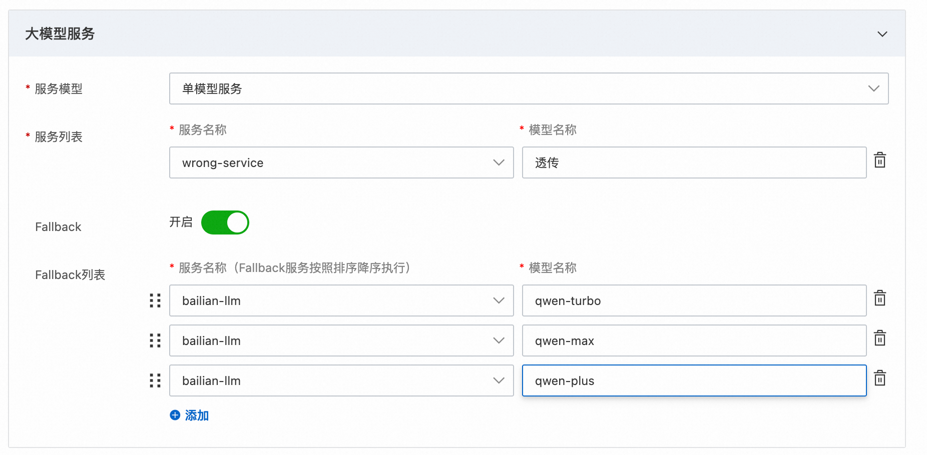 为了模拟 Fallback 的效果,在本例中,为 Dify 应用所访问的 Model API 配置一个无法访问的主模型服务,再配置一个可以正常访问的百炼模型服务。