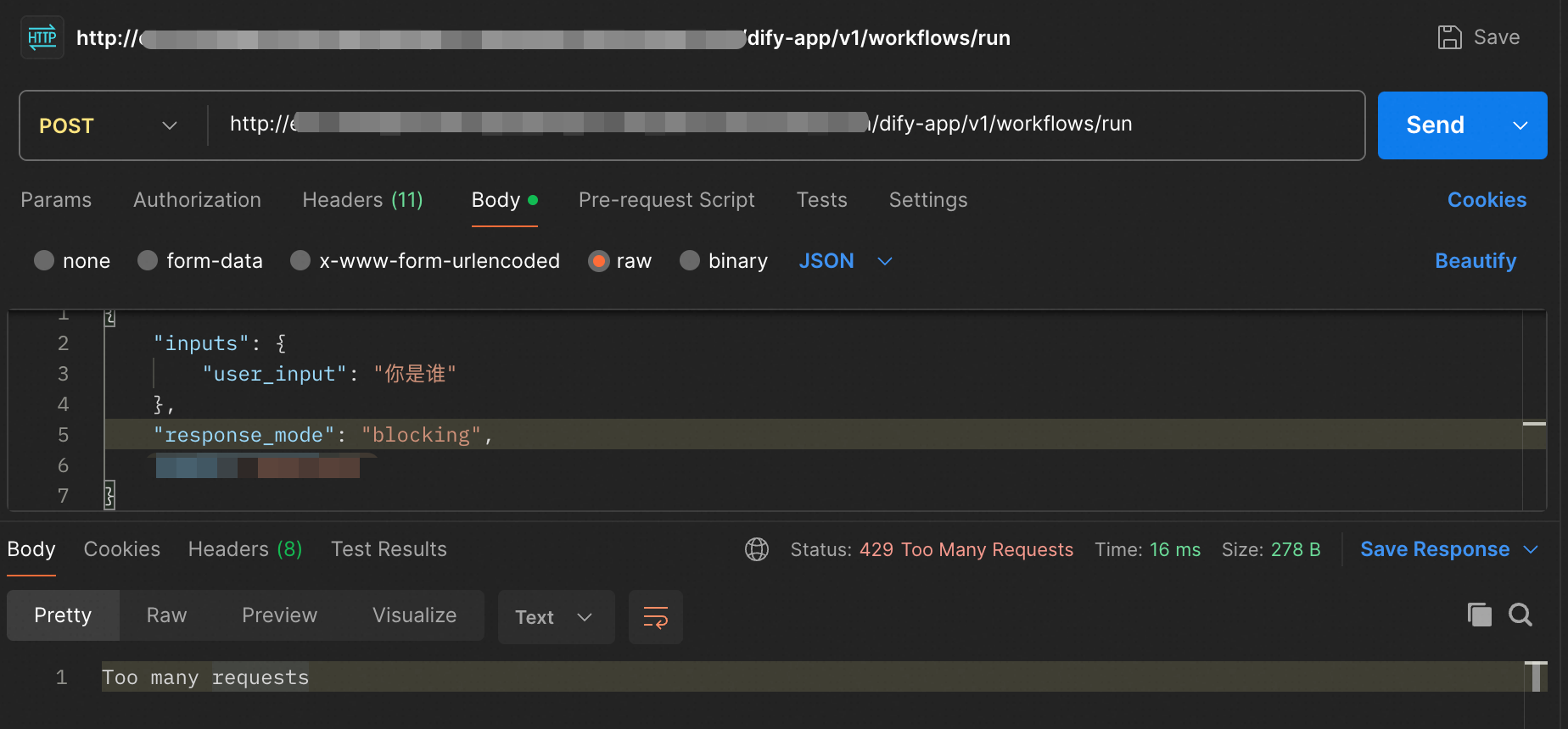 以下图为例,假设对某 Dify 应用设置 1 分钟只允许通过一次的请求。