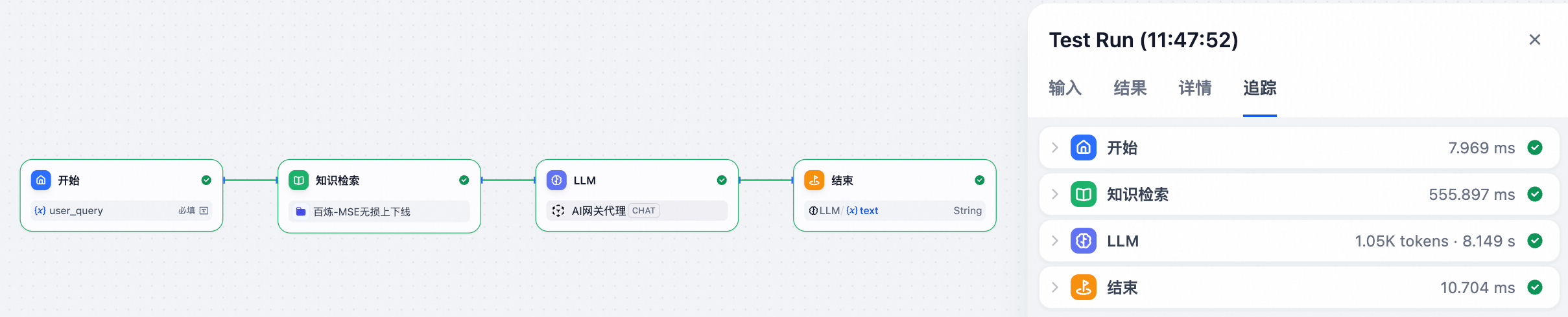 - 在 Dify 中运行 Workflow 或 Agent,验证通过 AI 网关代理访问 LLM 能正常返回结果,说明大模型出流量代理配置生效。