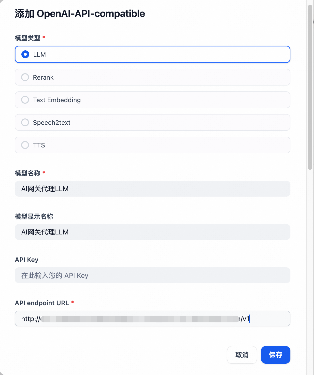 - 在 Dify 控制台,在右上角点击设置-模型供应商,为 OpenAI-API-compatible 添加模型,以 LLM 模型为例,其中模型类型、模型名称和 API Endpoint URL 为必填,API Endpoint URL 为步骤 1 在 AI 网关创建的 LLM API 的域名+前缀,其他参数可按需配置,点击保存。
