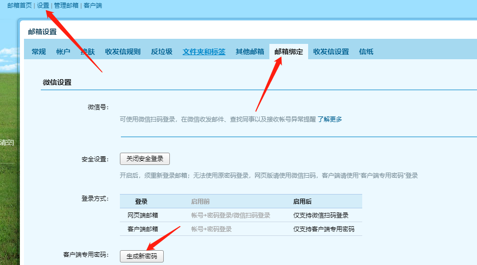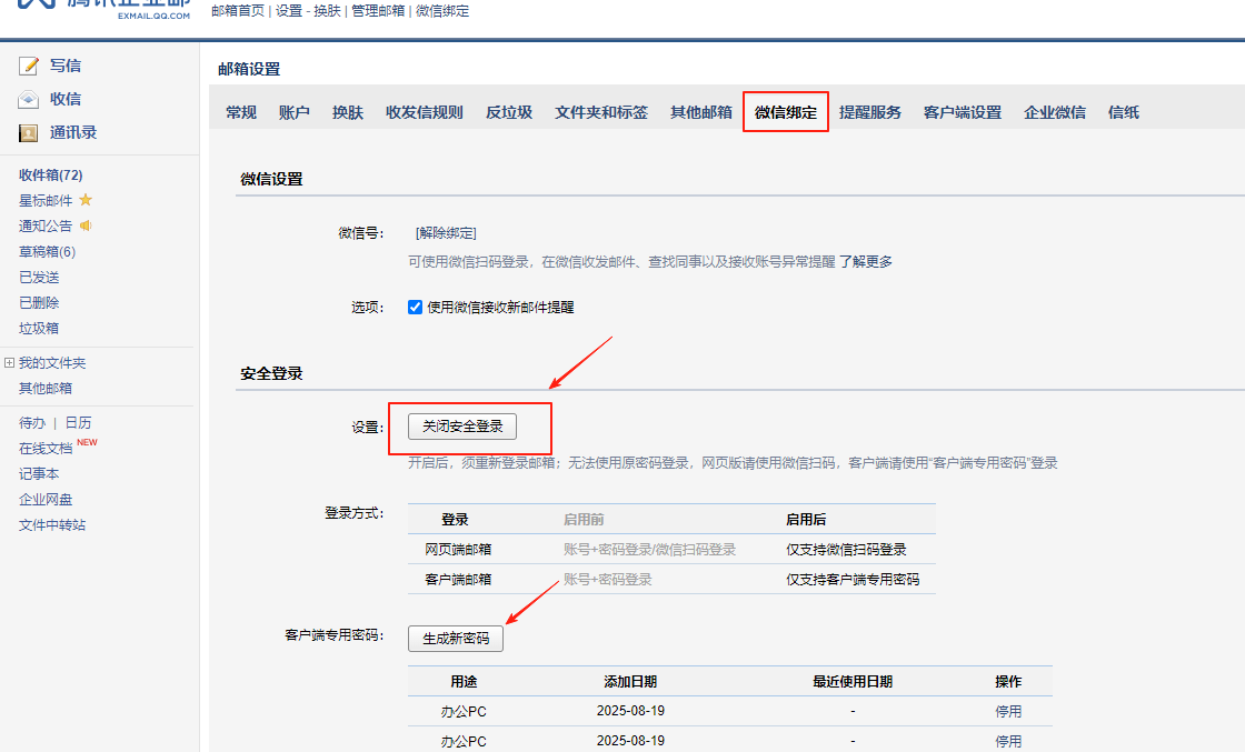 foxmail客户端可以配置腾讯企业邮箱收发信使用的,可使用客户端专属密码配置的,您可以在网页端https://exmail.qq.com/login登录到邮箱,点击设置--微信绑定/邮箱绑定--开启安全登录--点击生成新密码获取客户端专属密码的