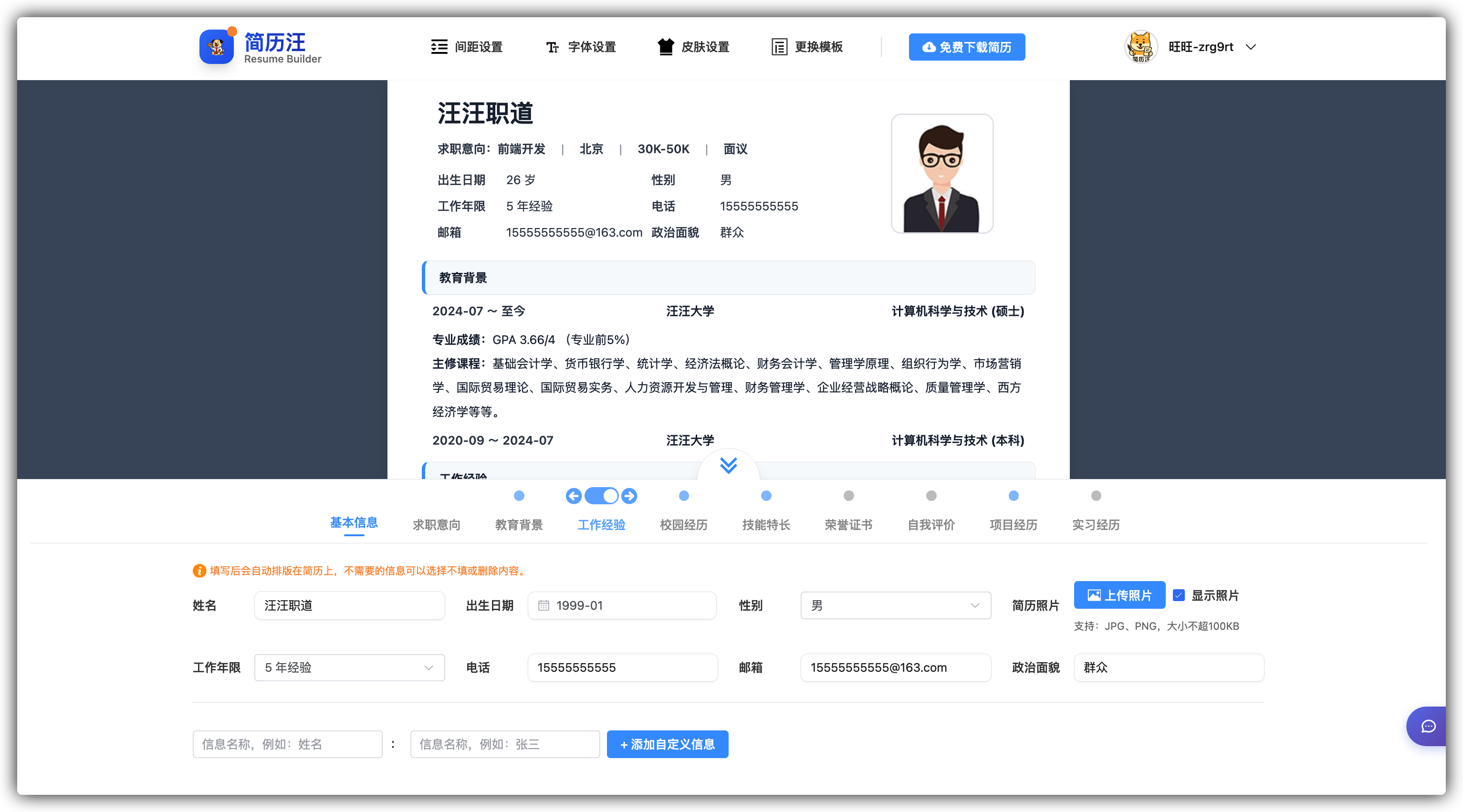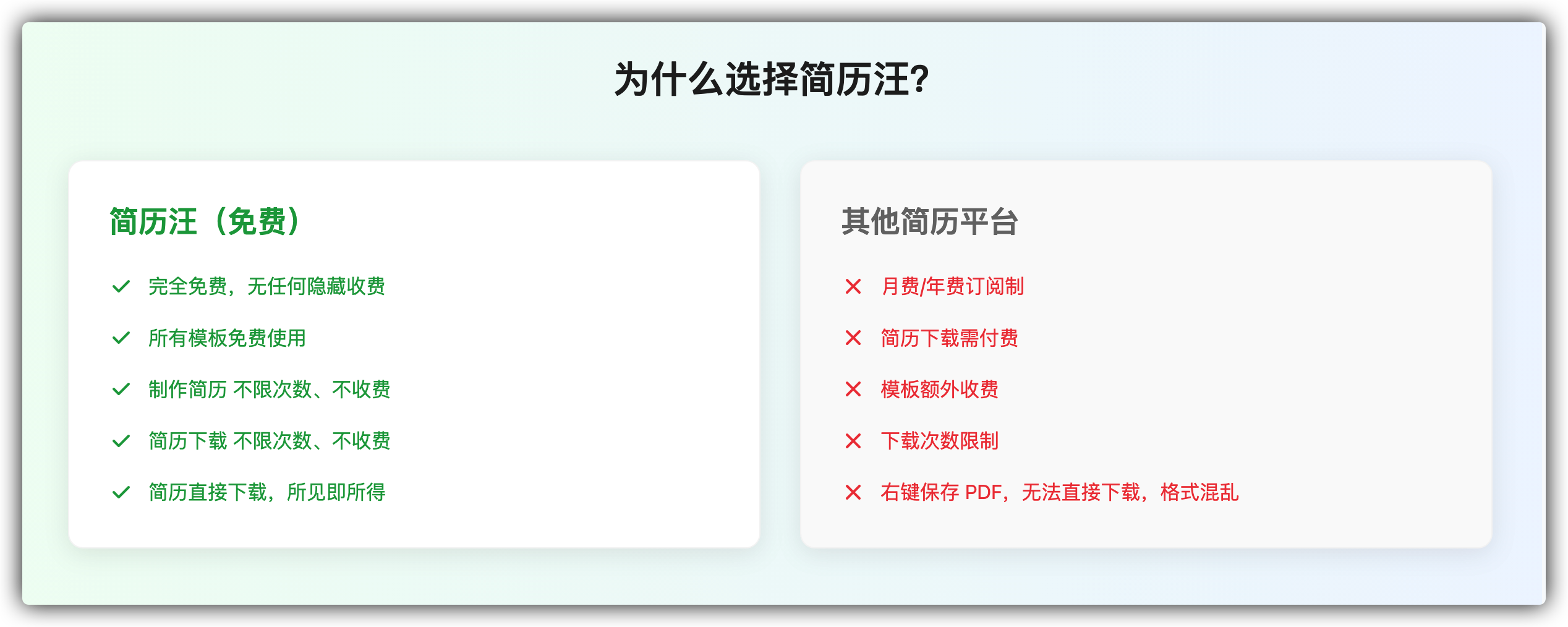 简历汪」不收你一分钱,不跟你玩套路,也不给你添堵。免费制作 & 免费一键下载简历告别右键保存 PDF 的反人类操作拿到「真·所见即所得」的 PDF 文件享受比收费平台还顺滑的编辑体验做简历,本就该是一件简单的事。后续我们还会增加AI 面试、招聘渠道、在线教程等功能。希望大家可以喜欢 😁 😁。