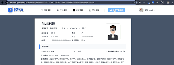 于是我花了三天,撸了一个自己的简历制作网站 「简历汪」:完全免费,真·免费,而且访问地址我就直接放这:https://resume.lgdsunday.club/